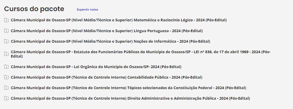 É o nosso tradicional material preparatório. É composto de cursos completos, de vídeos e PDFs (que podem ser estudados juntos ou separadamente), com teoria e questões comentadas. Esse material é feito para ser utilizado por alunos de qualquer nível, pois todas as matérias e assuntos são ensinados do ZERO ao AVANÇADO, com milhares de questões comentadas. Confira o que consta no nosso Pacote p/ Câmara Municipal de Osasco-SP