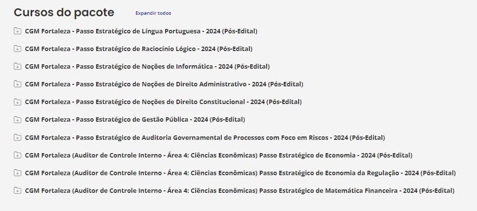 É o nosso material de revisão. É composto de relatórios em formato PDF que tratam de cada um dos assuntos das diferentes matérias exigidas no edital do concurso da CGM Fortaleza Na média, cada relatório possui 30 páginas. O Passo é bastante indicado para alunos intermediários e avançados. Em cada relatório, o assunto é abordado da seguinte forma:
