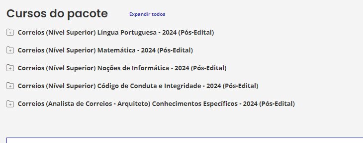É o nosso tradicional material preparatório. É composto de cursos completos, de vídeos e PDFs (que podem ser estudados juntos ou separadamente), com teoria e questões comentadas. Esse material é feito para ser utilizado por alunos de qualquer nível, pois todas as matérias e assuntos são ensinados do ZERO ao AVANÇADO, com milhares de questões comentadas. Confira o que consta no nosso Pacote p/ CORREIOS.