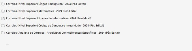 É o nosso tradicional material preparatório. É composto de cursos completos, de vídeos e PDFs (que podem ser estudados juntos ou separadamente), com teoria e questões comentadas. Esse material é feito para ser utilizado por alunos de qualquer nível, pois todas as matérias e assuntos são ensinados do ZERO ao AVANÇADO, com milhares de questões comentadas. Confira o que consta no nosso Pacote p/ CORREIOS.