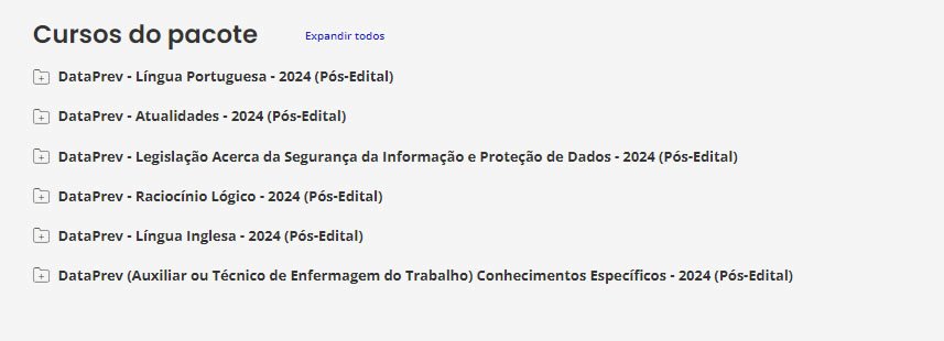 É o nosso tradicional material preparatório. É composto de cursos completos, de vídeos e PDFs (que podem ser estudados juntos ou separadamente), com teoria e questões comentadas. Esse material é feito para ser utilizado por alunos de qualquer nível, pois todas as matérias e assuntos são ensinados do ZERO ao AVANÇADO, com milhares de questões comentadas. Confira o que consta no nosso Pacote p/ DataPrev