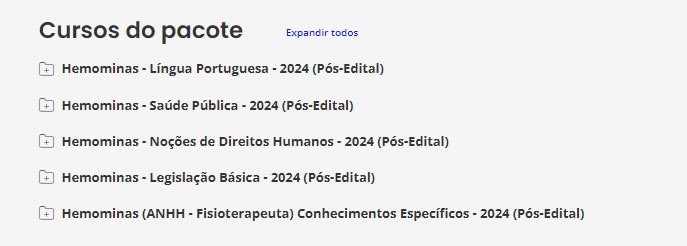 É o nosso tradicional material preparatório. É composto de cursos completos, de vídeos e PDFs (que podem ser estudados juntos ou separadamente), com teoria e questões comentadas. Esse material é feito para ser utilizado por alunos de qualquer nível, pois todas as matérias e assuntos são ensinados do ZERO ao AVANÇADO, com milhares de questões comentadas. Confira o que consta no nosso Pacote p/ Hemominas.