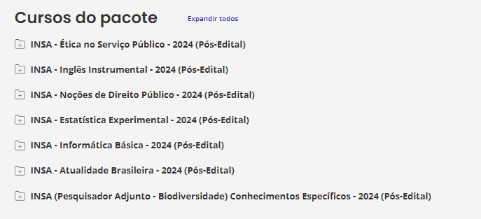 É o nosso tradicional material preparatório. É composto de cursos completos, de vídeos e PDFs (que podem ser estudados juntos ou separadamente), com teoria e questões comentadas. Esse material é feito para ser utilizado por alunos de qualquer nível, pois todas as matérias e assuntos são ensinados do ZERO ao AVANÇADO, com milhares de questões comentadas. Confira o que consta no nosso Pacote p/ INSA.