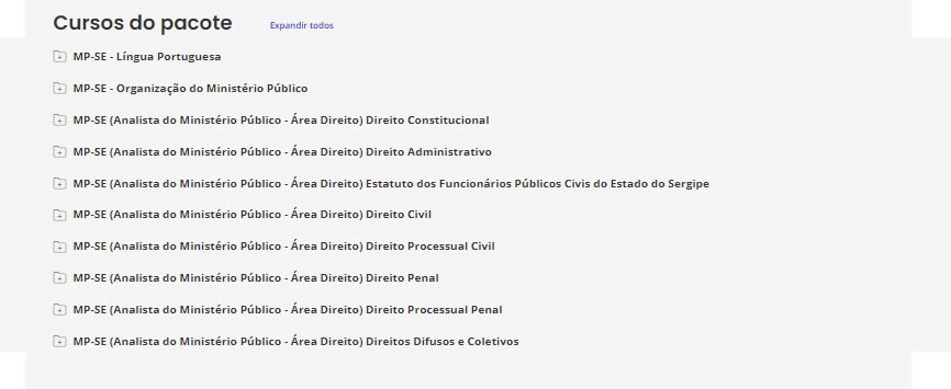 É o nosso tradicional material preparatório. É composto de cursos completos, de vídeos e PDFs (que podem ser estudados juntos ou separadamente), com teoria e questões comentadas. Esse material é feito para ser utilizado por alunos de qualquer nível, pois todas as matérias e assuntos são ensinados do ZERO ao AVANÇADO, com milhares de questões comentadas. Confira o que consta no nosso Pacote p/ MP-SE.