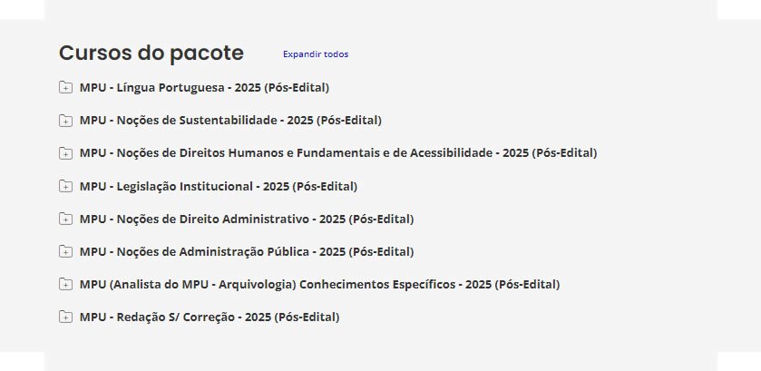É o nosso tradicional material preparatório. É composto de cursos completos, de vídeos e PDFs (que podem ser estudados juntos ou separadamente), com teoria e questões comentadas. Esse material é feito para ser utilizado por alunos de qualquer nível, pois todas as matérias e assuntos são ensinados do ZERO ao AVANÇADO, com milhares de questões comentadas. Confira o que consta no nosso Pacote p/ MPU.
