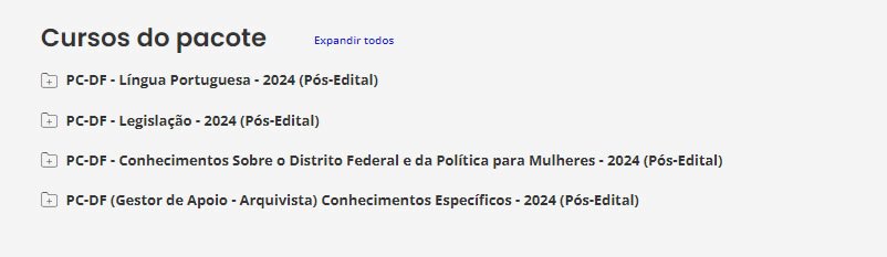 É o nosso tradicional material preparatório. É composto de cursos completos, de vídeos e PDFs (que podem ser estudados juntos ou separadamente), com teoria e questões comentadas. Esse material é feito para ser utilizado por alunos de qualquer nível, pois todas as matérias e assuntos são ensinados do ZERO ao AVANÇADO, com milhares de questões comentadas. Confira o que consta no nosso Pacote p/ PCDF: