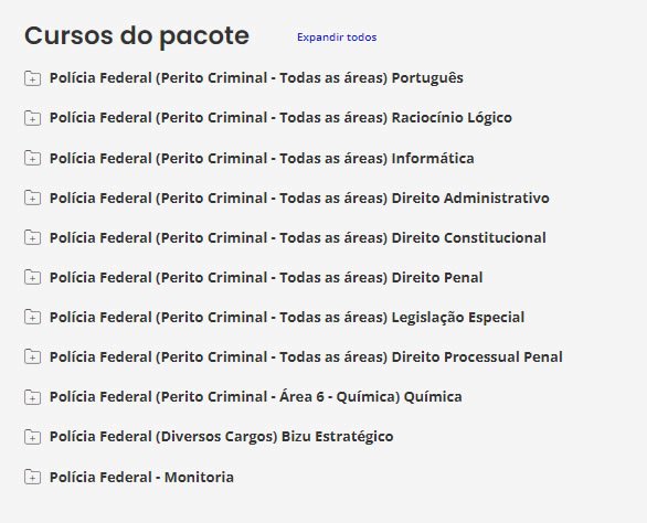É o nosso tradicional material preparatório. É composto de cursos completos, de vídeos e PDFs (que podem ser estudados juntos ou separadamente), com teoria e questões comentadas. Esse material é feito para ser utilizado por alunos de qualquer nível, pois todas as matérias e assuntos são ensinados do ZERO ao AVANÇADO, com milhares de questões comentadas. Confira o que consta no nosso Pacote p/ Perito Criminal Federal.