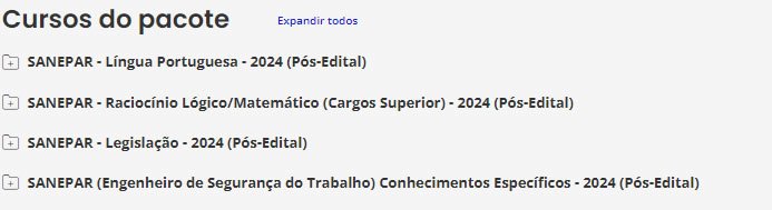 É o nosso tradicional material preparatório. É composto de cursos completos, de vídeos e PDFs (que podem ser estudados juntos ou separadamente), com teoria e questões comentadas. Esse material é feito para ser utilizado por alunos de qualquer nível, pois todas as matérias e assuntos são ensinados do ZERO ao AVANÇADO, com milhares de questões comentadas. Confira o que consta no nosso Pacote p/ SANEPAR