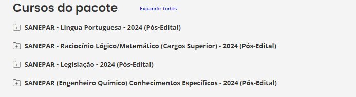 É o nosso tradicional material preparatório. É composto de cursos completos, de vídeos e PDFs (que podem ser estudados juntos ou separadamente), com teoria e questões comentadas. Esse material é feito para ser utilizado por alunos de qualquer nível, pois todas as matérias e assuntos são ensinados do ZERO ao AVANÇADO, com milhares de questões comentadas. Confira o que consta no nosso Pacote p/ SANEPAR