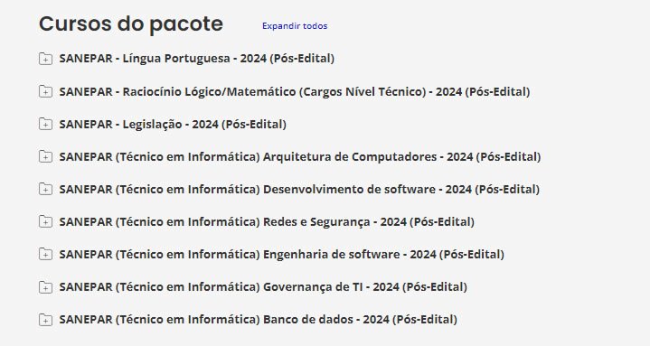 É o nosso tradicional material preparatório. É composto de cursos completos, de vídeos e PDFs (que podem ser estudados juntos ou separadamente), com teoria e questões comentadas. Esse material é feito para ser utilizado por alunos de qualquer nível, pois todas as matérias e assuntos são ensinados do ZERO ao AVANÇADO, com milhares de questões comentadas. Confira o que consta no nosso Pacote p/ SANEPAR