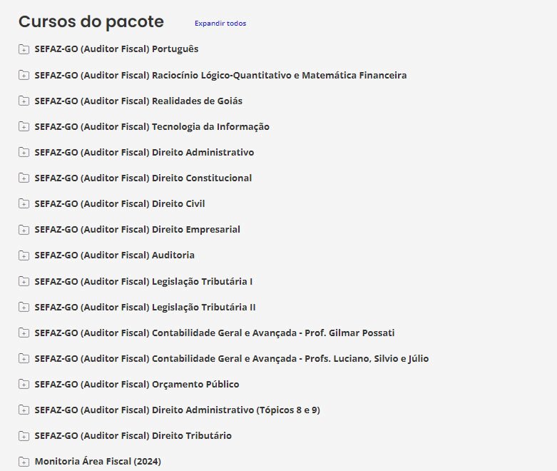 É o nosso tradicional material preparatório. É composto de cursos completos, de vídeos e PDFs (que podem ser estudados juntos ou separadamente), com teoria e questões comentadas. Esse material é feito para ser utilizado por alunos de qualquer nível, pois todas as matérias e assuntos são ensinados do ZERO ao AVANÇADO, com milhares de questões comentadas. Confira o que consta no nosso Pacote p/ SEFAZ-GO.
