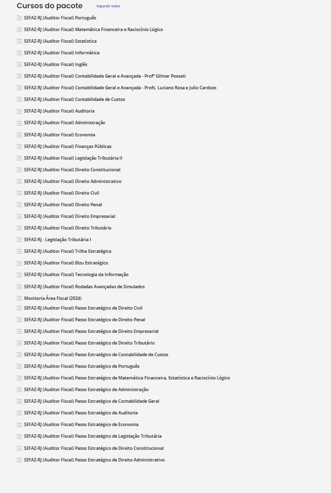 É o nosso tradicional material preparatório. É composto de cursos completos, de vídeos e PDFs (que podem ser estudados juntos ou separadamente), com teoria e questões comentadas. Esse material é feito para ser utilizado por alunos de qualquer nível, pois todas as matérias e assuntos são ensinados do ZERO ao AVANÇADO, com milhares de questões comentadas. Confira o que consta no nosso Pacote p/ SEFAZ-RJ.