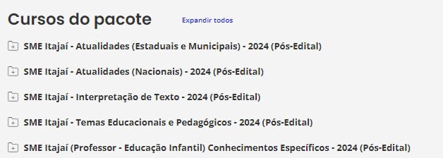É o nosso tradicional material preparatório. É composto de cursos completos, de vídeos e PDFs (que podem ser estudados juntos ou separadamente), com teoria e questões comentadas. Esse material é feito para ser utilizado por alunos de qualquer nível, pois todas as matérias e assuntos são ensinados do ZERO ao AVANÇADO, com milhares de questões comentadas. Confira o que consta no nosso Pacote p/ SME Itajaí.