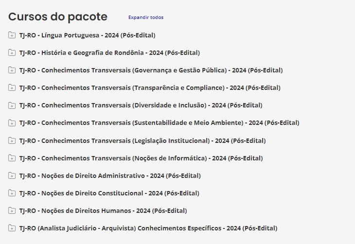 É o nosso tradicional material preparatório. É composto de cursos completos, de vídeos e PDFs (que podem ser estudados juntos ou separadamente), com teoria e questões comentadas. Esse material é feito para ser utilizado por alunos de qualquer nível, pois todas as matérias e assuntos são ensinados do ZERO ao AVANÇADO, com milhares de questões comentadas. Confira o que consta no nosso Pacote p/ TJ-RO.
