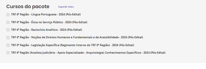 É o nosso tradicional material preparatório. É composto de cursos completos, de vídeos e PDFs (que podem ser estudados juntos ou separadamente), com teoria e questões comentadas. Esse material é feito para ser utilizado por alunos de qualquer nível, pois todas as matérias e assuntos são ensinados do ZERO ao AVANÇADO, com milhares de questões comentadas. Confira o que consta no nosso Pacote p/ TRF 6.