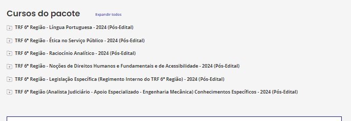 É o nosso tradicional material preparatório. É composto de cursos completos, de vídeos e PDFs (que podem ser estudados juntos ou separadamente), com teoria e questões comentadas. Esse material é feito para ser utilizado por alunos de qualquer nível, pois todas as matérias e assuntos são ensinados do ZERO ao AVANÇADO, com milhares de questões comentadas. Confira o que consta no nosso Pacote p/ TRF 6.