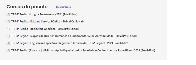 É o nosso tradicional material preparatório. É composto de cursos completos, de vídeos e PDFs (que podem ser estudados juntos ou separadamente), com teoria e questões comentadas. Esse material é feito para ser utilizado por alunos de qualquer nível, pois todas as matérias e assuntos são ensinados do ZERO ao AVANÇADO, com milhares de questões comentadas. Confira o que consta no nosso Pacote p/ TRF 6.