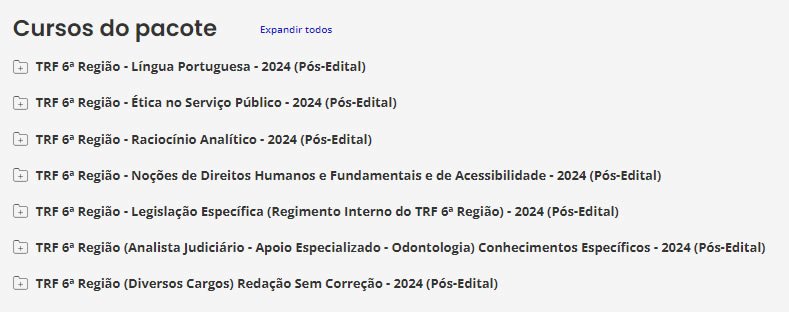 É o nosso tradicional material preparatório. É composto de cursos completos, de vídeos e PDFs (que podem ser estudados juntos ou separadamente), com teoria e questões comentadas. Esse material é feito para ser utilizado por alunos de qualquer nível, pois todas as matérias e assuntos são ensinados do ZERO ao AVANÇADO, com milhares de questões comentadas. Confira o que consta no nosso Pacote p/ TRF 6.