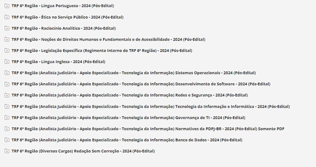 É o nosso tradicional material preparatório. É composto de cursos completos, de vídeos e PDFs (que podem ser estudados juntos ou separadamente), com teoria e questões comentadas. Esse material é feito para ser utilizado por alunos de qualquer nível, pois todas as matérias e assuntos são ensinados do ZERO ao AVANÇADO, com milhares de questões comentadas. Confira o que consta no nosso Pacote p/ TRF 6.