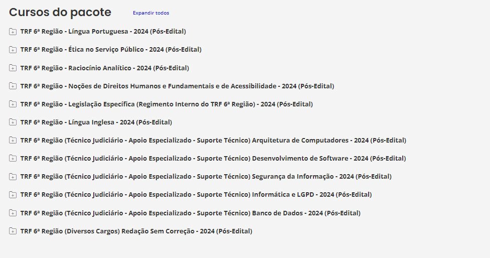 É o nosso tradicional material preparatório. É composto de cursos completos, de vídeos e PDFs (que podem ser estudados juntos ou separadamente), com teoria e questões comentadas. Esse material é feito para ser utilizado por alunos de qualquer nível, pois todas as matérias e assuntos são ensinados do ZERO ao AVANÇADO, com milhares de questões comentadas. Confira o que consta no nosso Pacote p/ TRF 6.