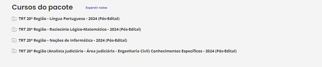 É o nosso tradicional material preparatório. É composto de cursos completos, de vídeos e PDFs (que podem ser estudados juntos ou separadamente), com teoria e questões comentadas. Esse material é feito para ser utilizado por alunos de qualquer nível, pois todas as matérias e assuntos são ensinados do ZERO ao AVANÇADO, com milhares de questões comentadas. Confira o que consta no nosso Pacote p/ TRT-SE 20ª