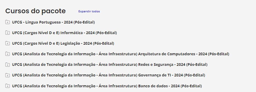 É o nosso tradicional material preparatório. É composto de cursos completos, de vídeos e PDFs (que podem ser estudados juntos ou separadamente), com teoria e questões comentadas. Esse material é feito para ser utilizado por alunos de qualquer nível, pois todas as matérias e assuntos são ensinados do ZERO ao AVANÇADO, com milhares de questões comentadas. Confira o que consta no nosso Pacote p/ UFCG