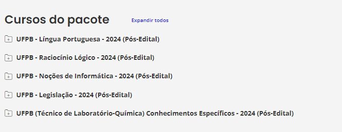 É o nosso tradicional material preparatório. É composto de cursos completos, de vídeos e PDFs (que podem ser estudados juntos ou separadamente), com teoria e questões comentadas. Esse material é feito para ser utilizado por alunos de qualquer nível, pois todas as matérias e assuntos são ensinados do ZERO ao AVANÇADO, com milhares de questões comentadas. Confira o que consta no nosso Pacote p/ UFPB.
